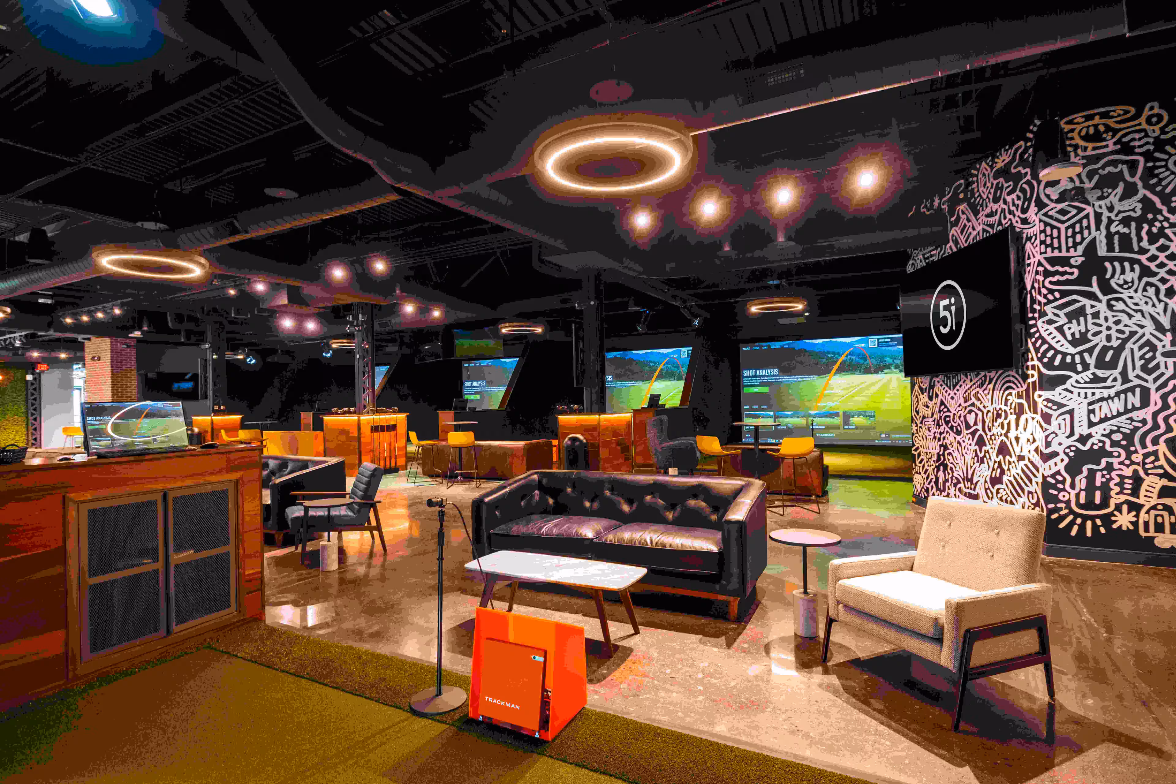 Located in Philadelphia's Northern Liberties neighborhood near Fishtown, Five Iron Golf is an all-in-one golf & sports bar featuring a variety of ways to play and practice. Enjoy great dining and a full-service bar regardless of your golf expertise. Some visit Five Iron Golf to improve their game, working with highly-trained golf coaches to get a Swing Evaluation, personalized lessons, or a Tour-level club fitting. Others cheers to a fun night out with friends. Compete in fun mini-games or play a round of 18 on world-class PGA Tour venues like Pebble Beach and 200+ other famous courses. Enjoy weekly events, from afternoon Happy Hour to late-night specials. Or, become a member for 90 mins. of free golf everyday along with complimentary coffee and breakfast. Book an indoor golf simulator bay today for you and up to 5 friends. 5i is also the perfect event venue for corporate outings, celebrations, and just an excuse to get the gang together. Discover a new golf bar experience in one of Philly's most creative and energetic neighborhoods at Five Iron Golf.